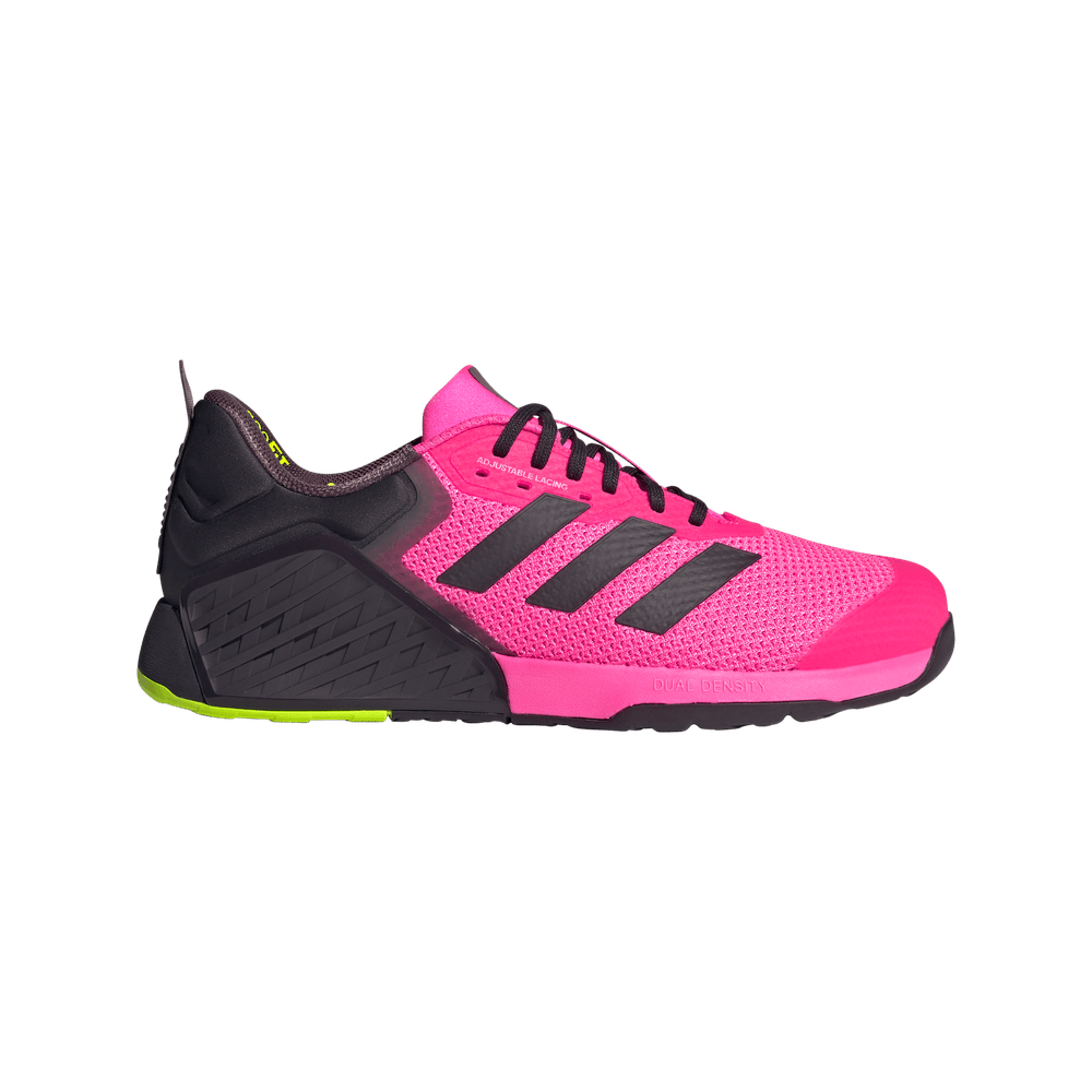 Tanto si levantas, empujas o tiras, la Dropset 3 te ofrece la estabilidad que necesitas en tus entrenamientos de fuerza. La mediasuela de doble densidad amortigua cada repetición intensa, mientras que el refuerzo lateral de TPU mantiene el mediopié firme. La tecnología adidas HEAT.RDY ayuda a mantener tus pies frescos incluso en los momentos de máxima intensidad. Su horma, más ancha que la estándar, se adapta a la hinchazón natural del pie durante el esfuerzo. Zapatilla de entrenamiento de fuerza para una sujeción estable. Zapatilla de training Dropset 3